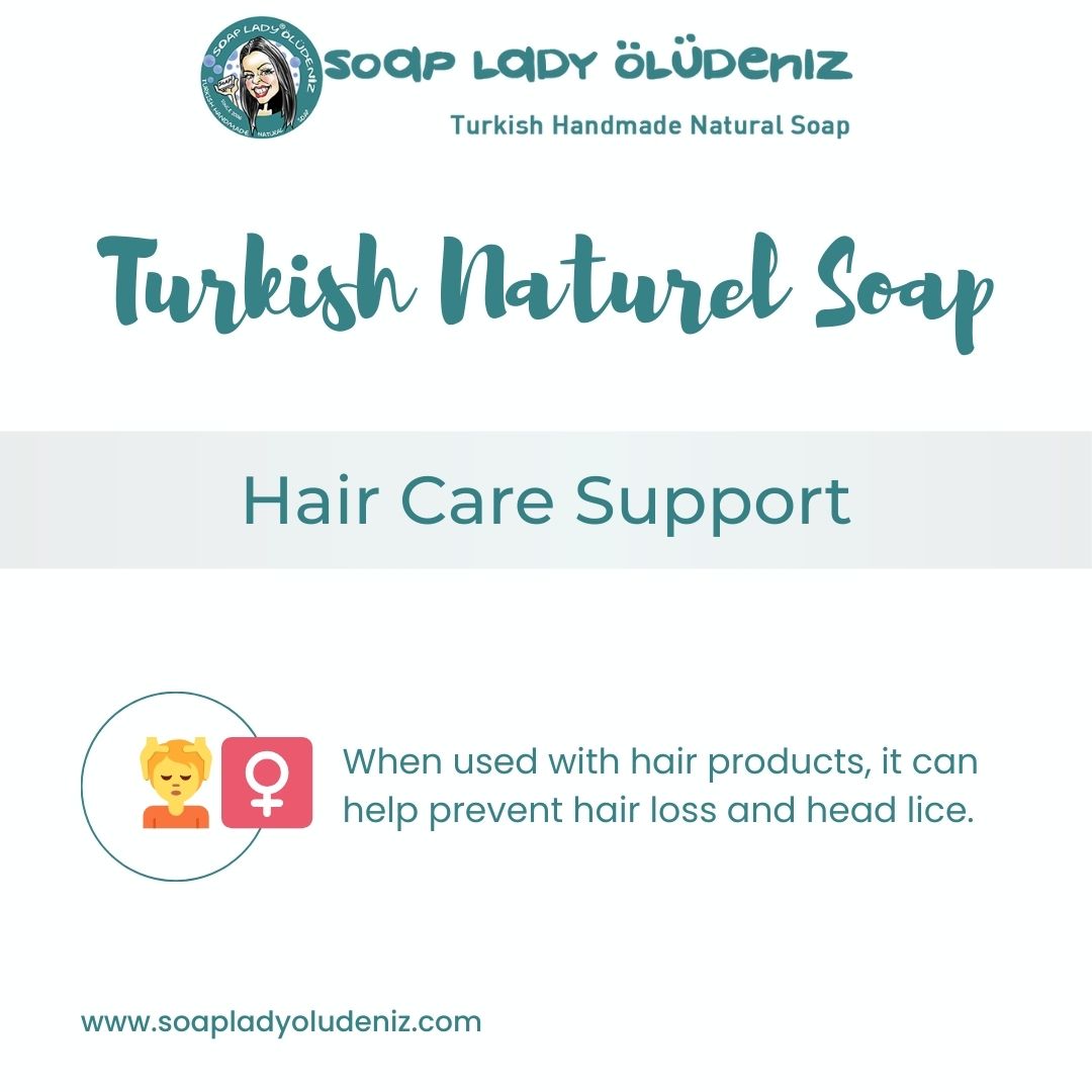 The Bitter Almond oil in our soap helps dry cracked skin. To revitalise and to recover former softness massage the soap onto the affected areas when the skin begins to look and feel dry.  It also helps to prevent fungal infections.  Used with hair products it can help to prevent hair loss through gentle massage of the scalp and hair roots and can help to prevent hair nits.  This is a soap to use when feeling stressed and tired and just needing to relax.